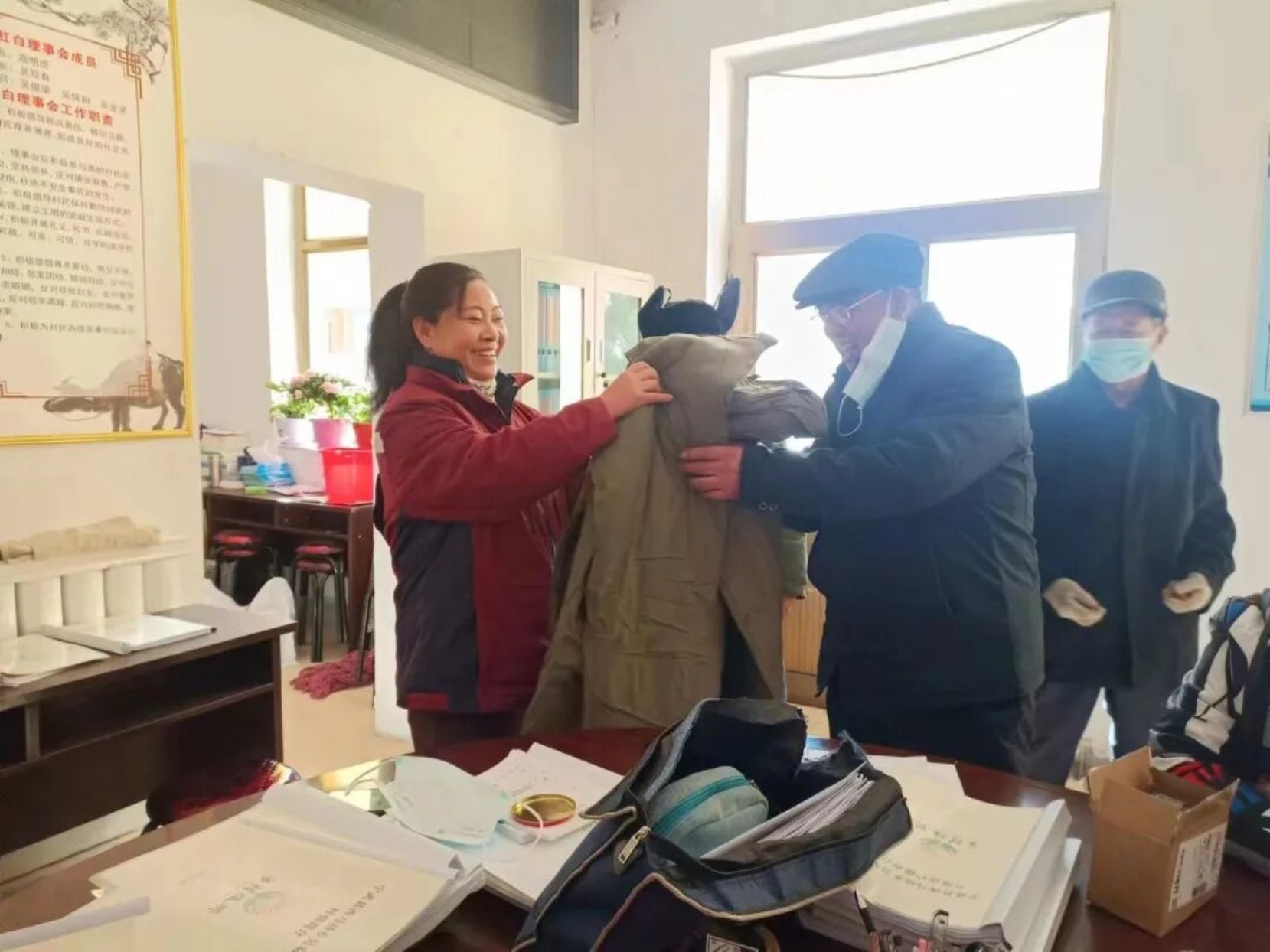 图二·宁武县民政局工作人员为特困供养对象发放棉衣