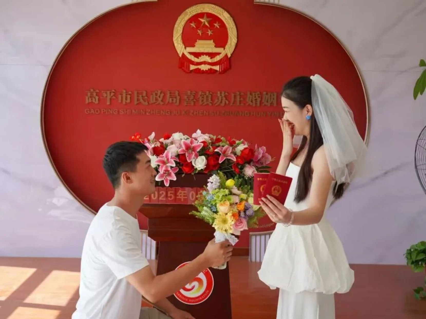 图二·一对新人在高平市景区婚姻登记点——喜镇苏庄婚姻登记处喜结良缘